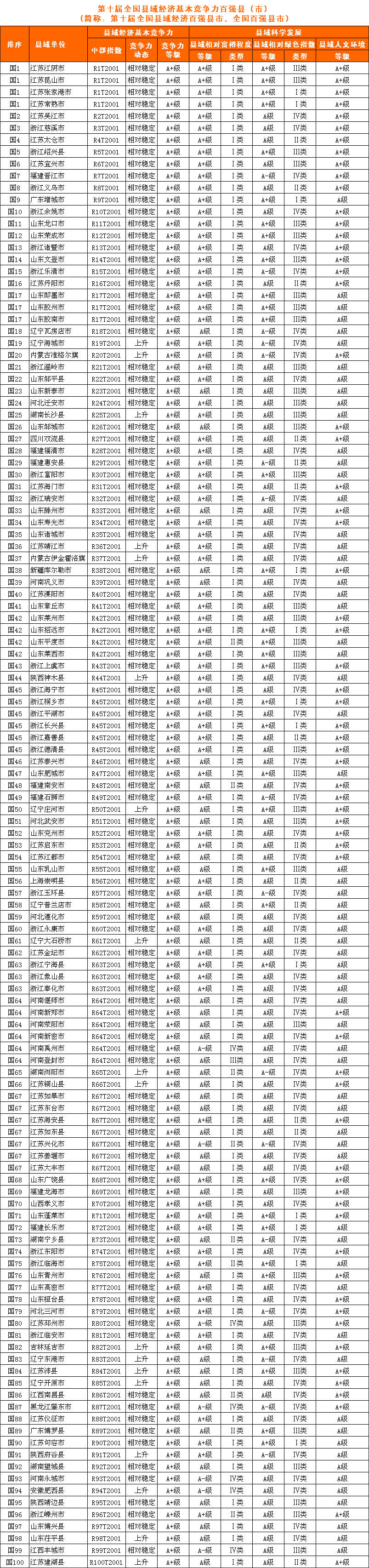 据悉,第十届全国县域经济基本竞争力百强县(市),具体分布在18个省(市、区),分别是:江苏省数量最多为28个,浙江省25个,山东省27个,福建省7个,河南省8个,辽宁省7个,河北省4个,湖南省4个,陕西省3个,山西省 1个,江西省 2个,广东省2个,内蒙古自治区2个,吉林省1个,黑龙江省1个,上海市1个,四川省1个,新疆维吾尔自治区1个。其中,江苏省江阴市、昆山市、张家港市、常熟市四个县级市作为“区域经济强县统筹发展组团”并列“全国百强县”第一。刘福刚所长在接受采访时表示,由于“长三角规划实施”、“江苏沿海开发”和“跨江联动”等区域振兴政策效应的叠加,苏北地区县域经济出现了快速发展的势头,在本次评价中,出现了“苏北速度”的现象,苏北地区有两个县新进全国百强县,其中江苏邳州市由去年的排名91位跃居今年的80位。