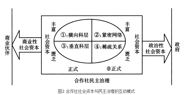 映照于合作社治理的现实实践,可以依照农民专业合作社中社会资本的丰富程度与合作社的民主治理程度,把实践中的合作社治理划归为四种基本型态:即横向科层型态、紧密网络型态、垂直科层型态与稀疏关系型态。当然,每一种合作社治理型态在现实中都能找到它的对照与原型,农民专业合作社的社会资本丰富度与民主治理程度的交互与互动机制如下图所示。