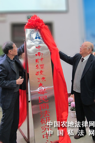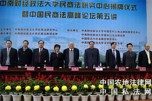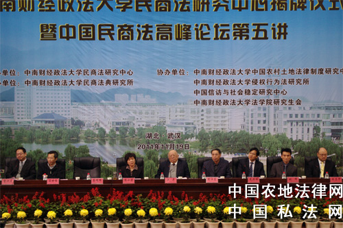 2011年11月19日上午9:00,中南财经政法大学民商法研究中心揭牌仪式暨中国民商法高峰论坛第五讲在文泓楼一楼学术报告厅顺利举行。本次活动由中南财经政法大学民商法研究中心主办,中南财经政法大学民商法典研究所承办。